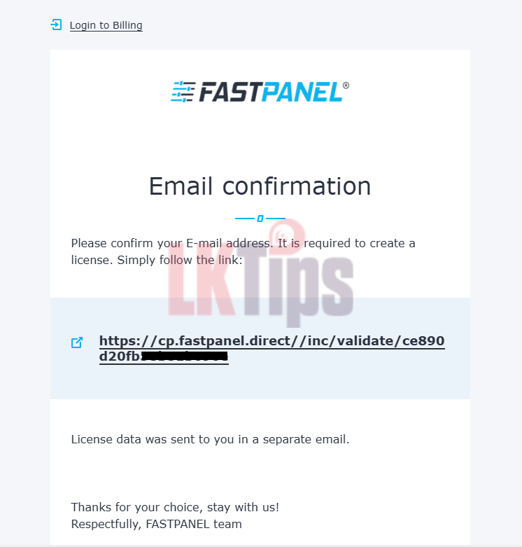 Link එක click කිරීමෙන් පසු License එක සක්රීය වෙනවා කියලා තහවුරු කරන message එකක් පෙන්වයි. (Fast Panel වෙබ් අඩවියේ ගිණුමකට ලොග් වීමක් අවශ්ය නැහැ. Redirect වන්නේ billing system එකට විතරයි.)